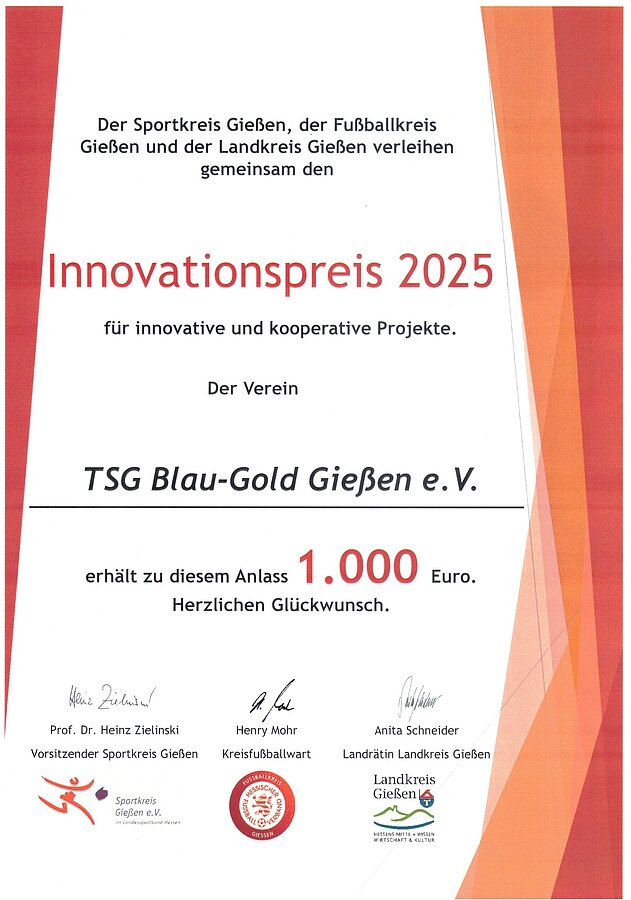 Die TSG Blau-Gold Gießen gewinnt mit ihrer Initiative “Initiative zur Gewinnung von Übungsleitern” den mit 1000€ dotierten Innovationspreis.